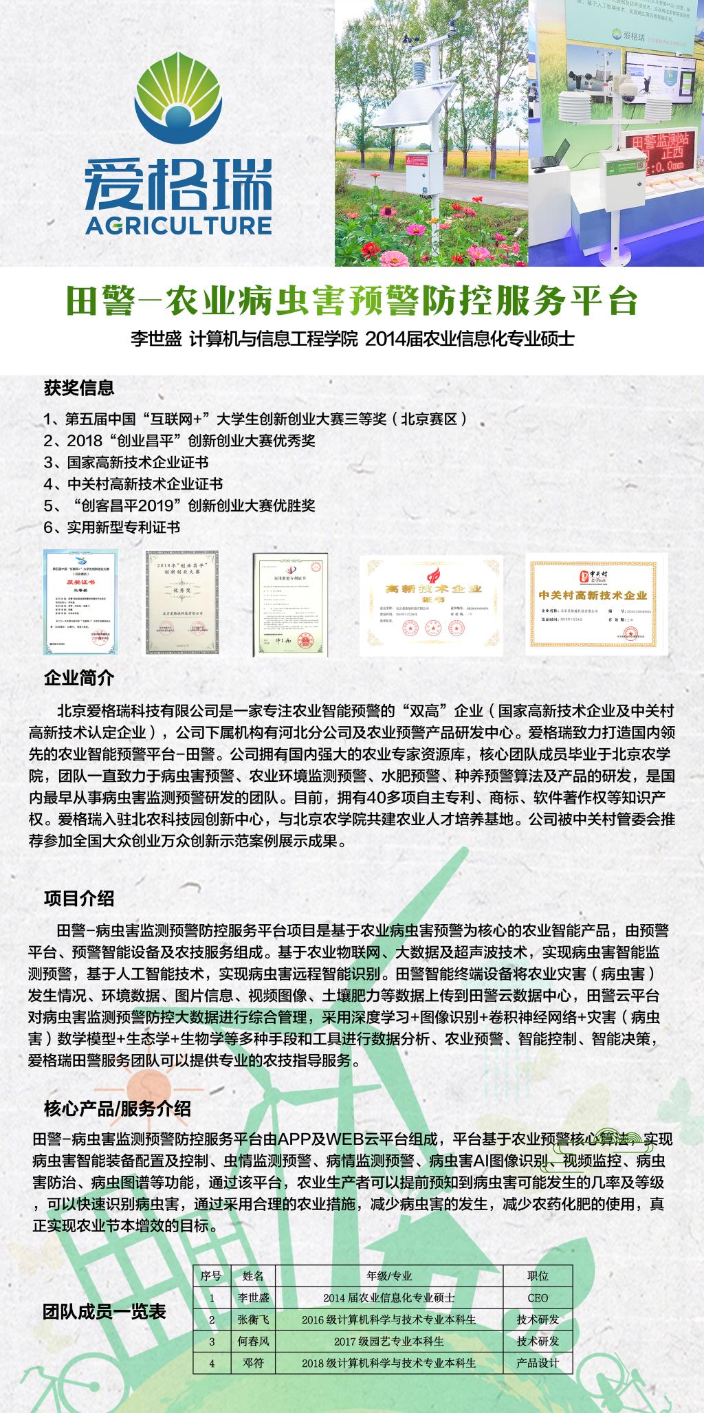 yl23411永利官网优秀老员工创新创业团队展示(三)——田警—农业病虫害预警防控服务平台