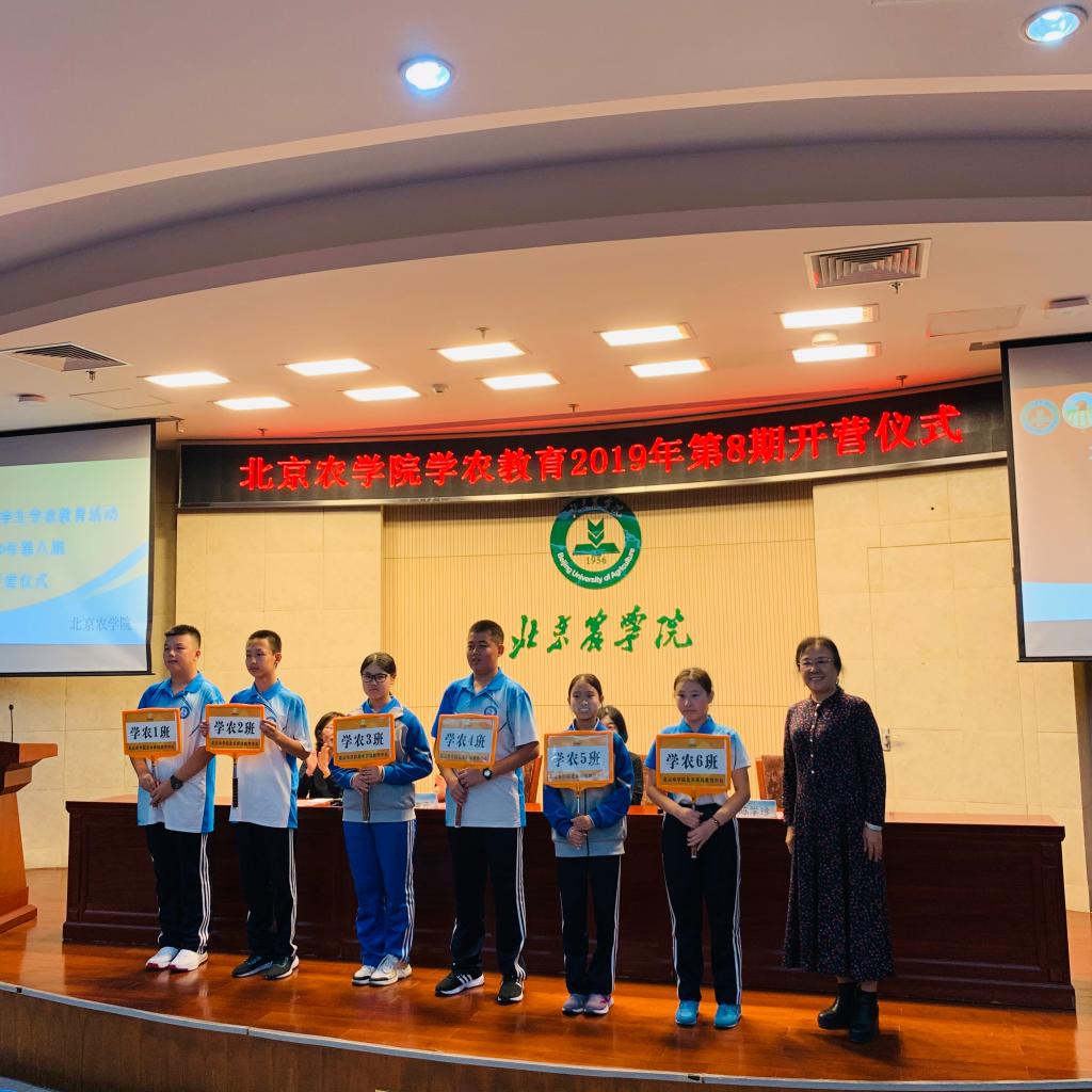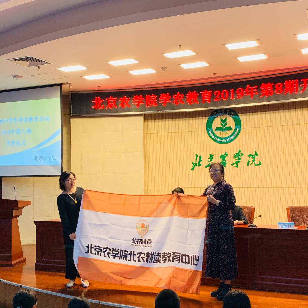 yl23411永利官网北农耕读教育中心主管陈学珍教授为公司授旗,并为学农班授牌。