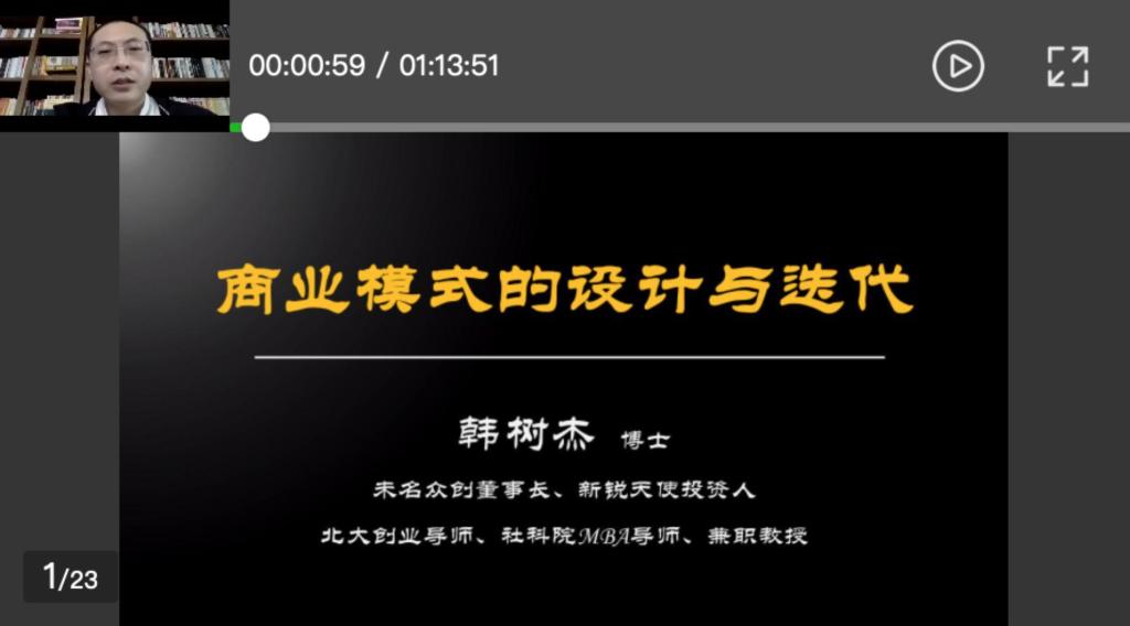 如有同学需回看3月27日韩树杰老师“商业模式的设计与迭代”课程,请扫描下方二维码: