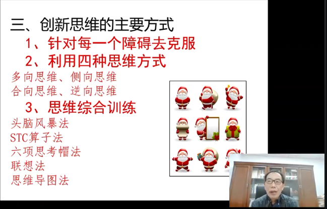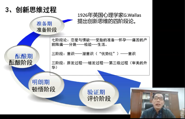 本次课程中,王滨教授为同学们进行了“如何选择创新课题”之“创新思维过程与方法”的讲授,具体从“了解是什么阻碍了思维创新”“掌握定势思维与偏见思维的特点和表现”“如何培养批判性精神和独立思考精神”“理解并掌握几种创新思维的本质、特点和方法”“将发散思维、逻辑思维、联想思维等应用于实践”等方面为同学们进行了系统讲解。本期讲座有202人次在线观看并进行交流。