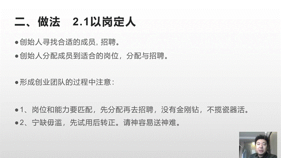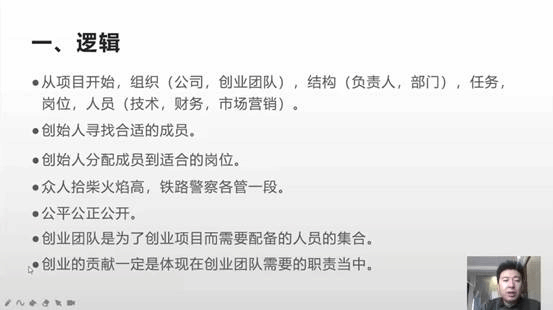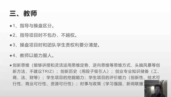 本次课程中,孙锡泉老师具体从“老员工创业指导的逻辑”“老员工创业指导的做法”“教师在创业团队中的作用”三个方面进行讲述,其中包括从创业项目开始进行组织、结构、任务、岗位、人员的设置;寻找适合成员、分配适合岗位、形成创业团队;创业团队中老师的角色等内容。