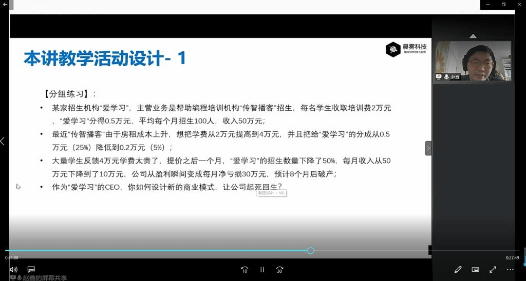 12月10日晚,“老员工创客行”创新创业系列教育课程第四讲精彩开讲。本次直播课邀请了天使投资人、晨雾科技创始人赵鑫老师,以“商业模式(上)”为主题进行了精彩分享。