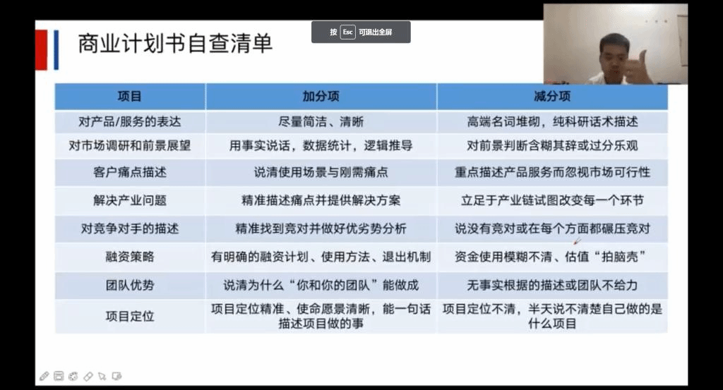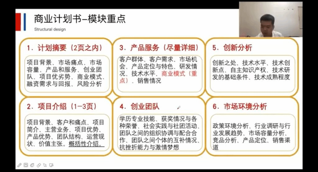 本次课程,郑超老师重点讲解了商业计划书的模块重点,并从10个模块重点中来阐述如何打造优秀的商业计划书。直播课共有200多人观看。