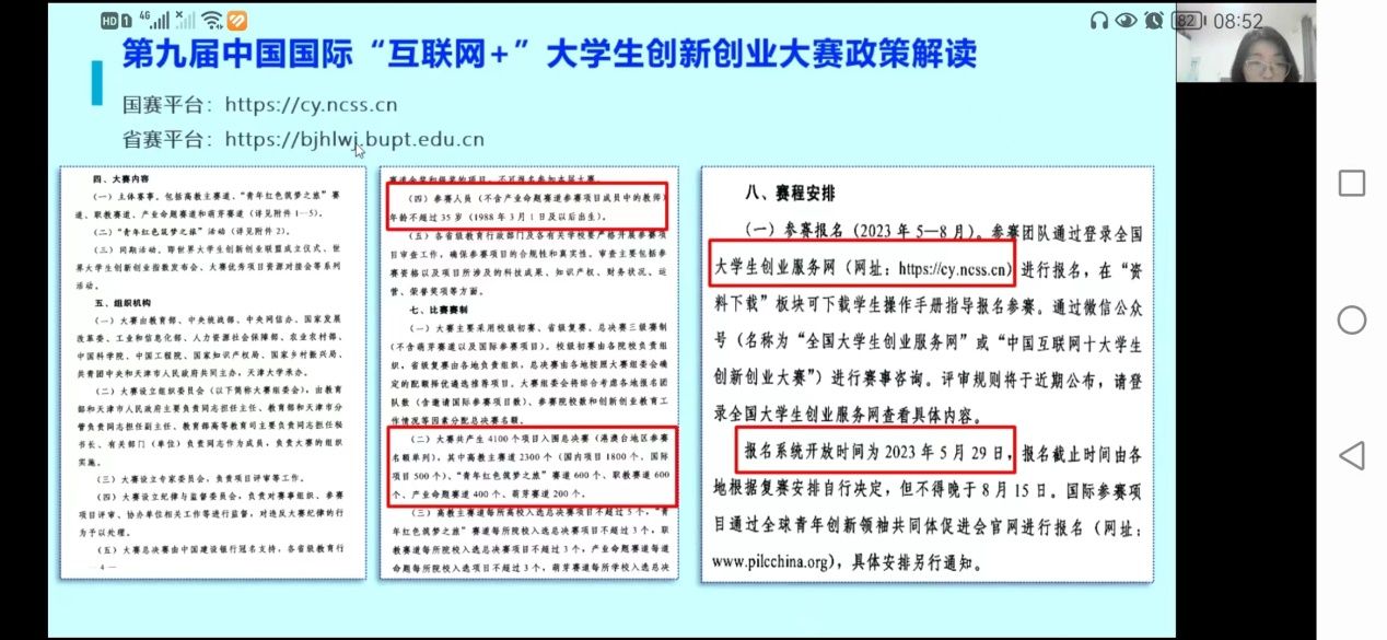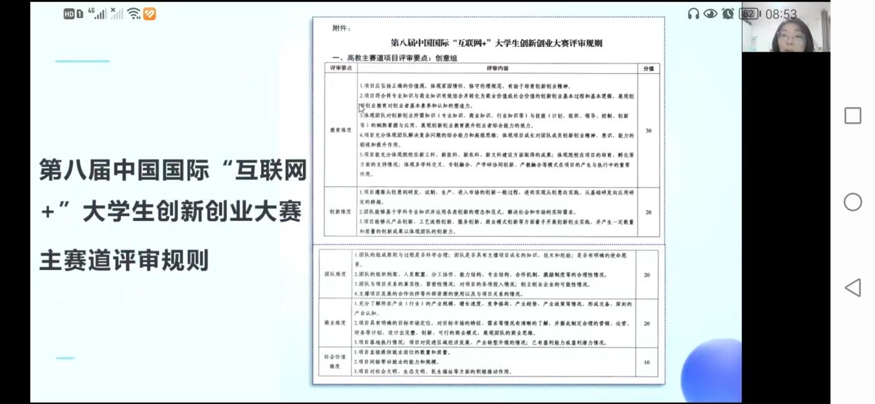 为引导和激励公司员工积极投入创新创业活动,营造浓厚的创新创业氛围,培养公司青年员工的创新和实践能力,推动创新创业教育工作的深入开展,对第九届中国国际“互联网+”老员工创新创业大赛的相关安排和比赛流程有更加清晰的了解。6月4日晚七点,通过线上腾讯会议,创新创业公司副经理孙曦为同学们进行第九届“互联网+”备赛前的宣讲,孙老师以大赛的双创教育改革的四个纲领性文件的引领开场,通过往届大赛回顾来看历届的发展,从参赛对象、各赛道的异同、赛道组别的具体要求及区分到各赛道评审规则,层层细致深入进行了讲解。