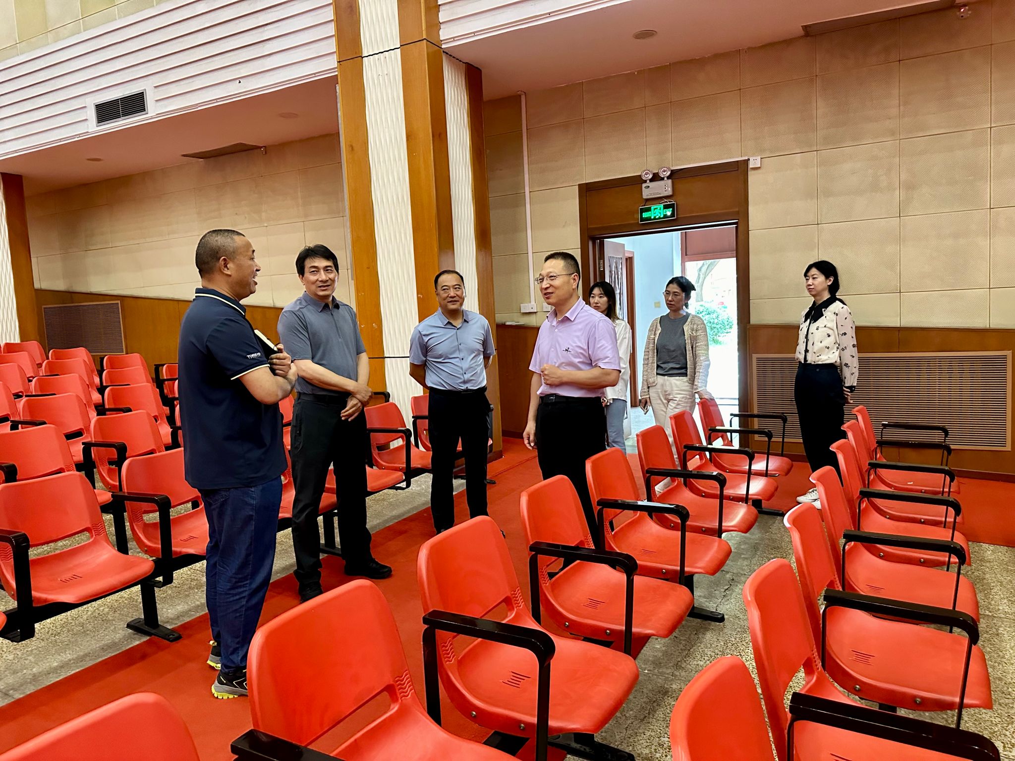 程文华一行现场考察了第一食堂、礼堂、图书馆一层报告厅及三层研讨交流会议室等保障继续教育开展的相关教学设施。