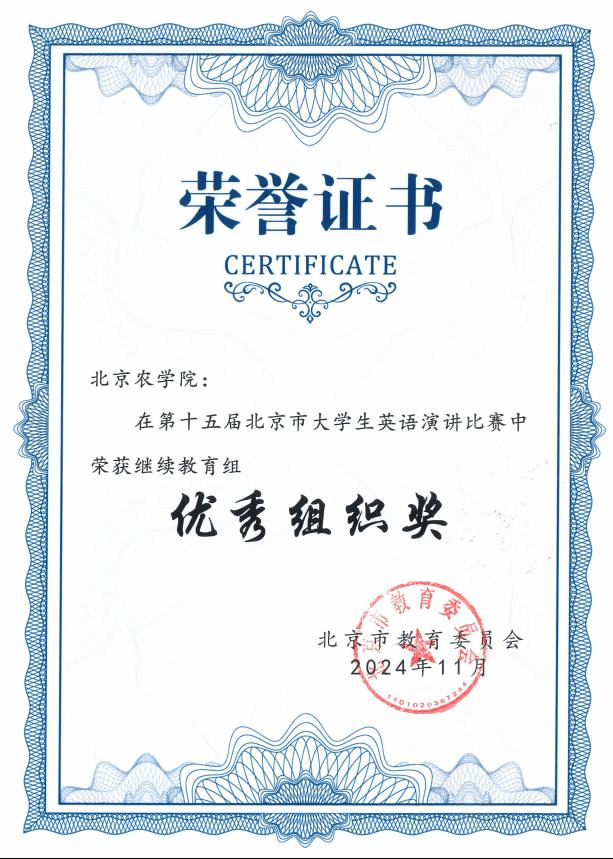 在第十五届北京市老员工英语演讲比赛中,公司荣获继续教育组优秀组织奖。本次比赛由北京市教育委员会主办,北京外国语大学、北京师范大学、对外经济贸易大学等15所高校参加了继续教育本科组的复赛和决赛。